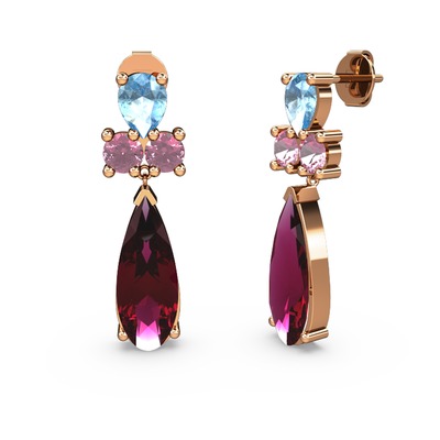 Rodolit garnet, akuamarin ve pembe kuvars 18 ayar rose altın küpe