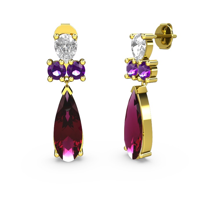 Rodolit garnet, beyaz zirkon ve ametist 18 ayar altın küpe