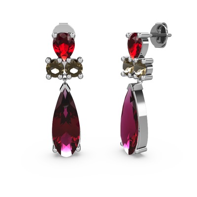 Rodolit garnet, garnet ve dumanlı kuvars 18 ayar beyaz altın küpe
