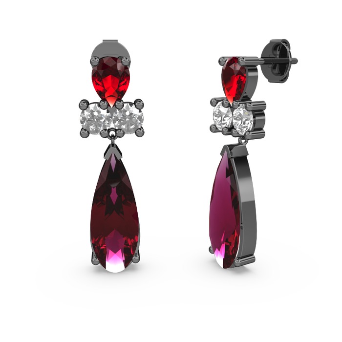 Rodolit garnet, garnet ve swarovski 925 ayar siyah rodyum kaplama gümüş küpe