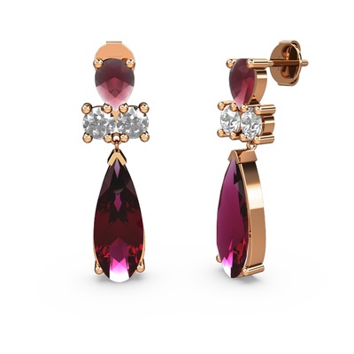 Rodolit garnet, kök yakut ve beyaz zirkon 8 ayar rose altın küpe