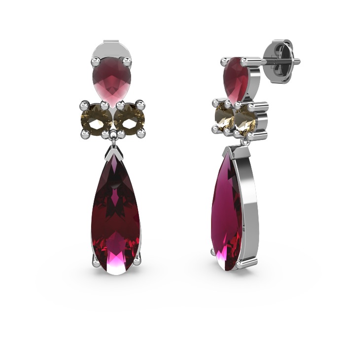 Rodolit garnet, kök yakut ve dumanlı kuvars 18 ayar beyaz altın küpe