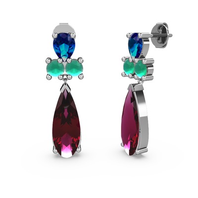 Rodolit garnet, lab safir ve kök zümrüt 14 ayar beyaz altın küpe