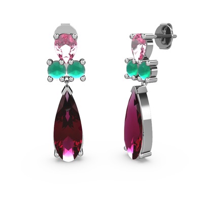 Rodolit garnet, pembe kuvars ve kök zümrüt 925 ayar gümüş küpe
