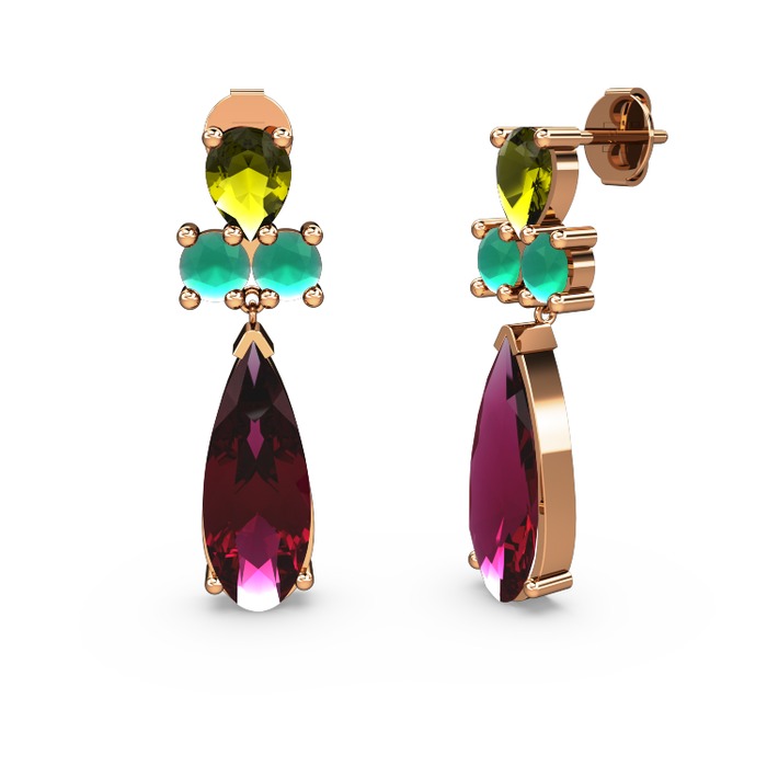 Rodolit garnet, peridot ve kök zümrüt 18 ayar rose altın küpe