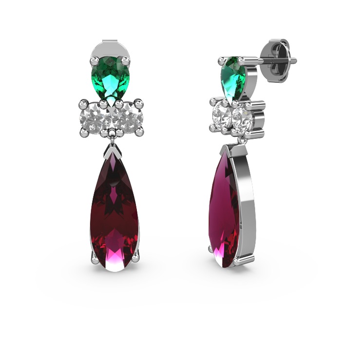Rodolit garnet, yeşil kuvars ve beyaz zirkon 18 ayar beyaz altın küpe