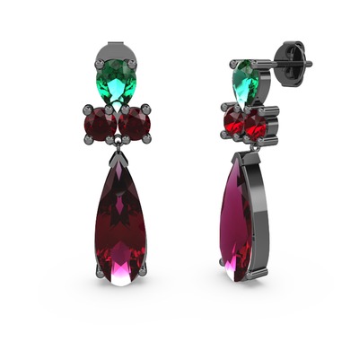 Rodolit garnet, yeşil kuvars ve garnet 925 ayar siyah rodyum kaplama gümüş küpe