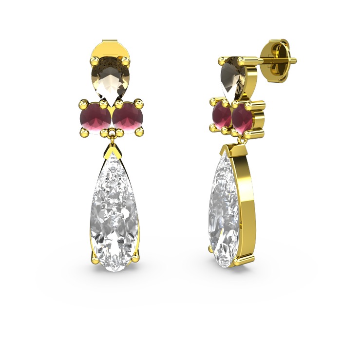 Swarovski, dumanlı kuvars ve kök yakut 18 ayar altın küpe