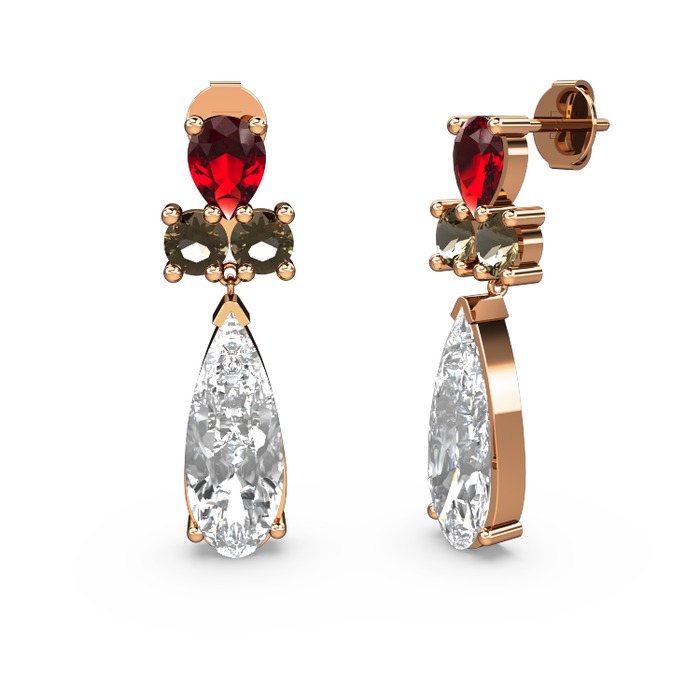 Swarovski, garnet ve dumanlı kuvars 18 ayar rose altın küpe