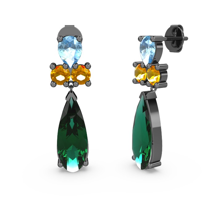 Yeşil kuvars, akuamarin ve sitrin 925 ayar siyah rodyum kaplama gümüş küpe