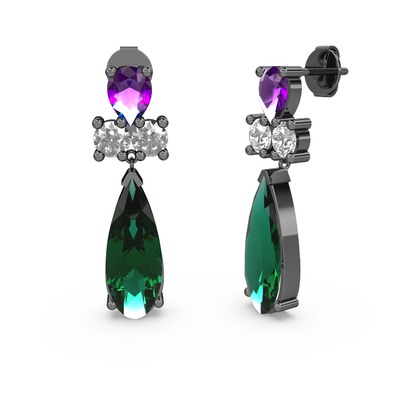 Yeşil kuvars, ametist ve beyaz zirkon 925 ayar siyah rodyum kaplama gümüş küpe