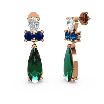 Yeşil kuvars, beyaz zirkon ve lab safir 14 ayar rose altın küpe