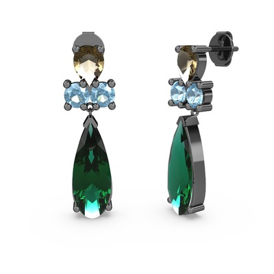 Yeşil kuvars, dumanlı kuvars ve akuamarin 925 ayar siyah rodyum kaplama gümüş küpe