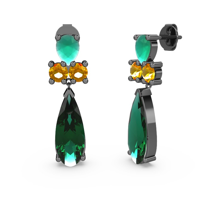 Yeşil kuvars, kök zümrüt ve sitrin 925 ayar siyah rodyum kaplama gümüş küpe