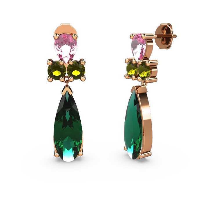 Yeşil kuvars, pembe kuvars ve peridot 14 ayar rose altın küpe