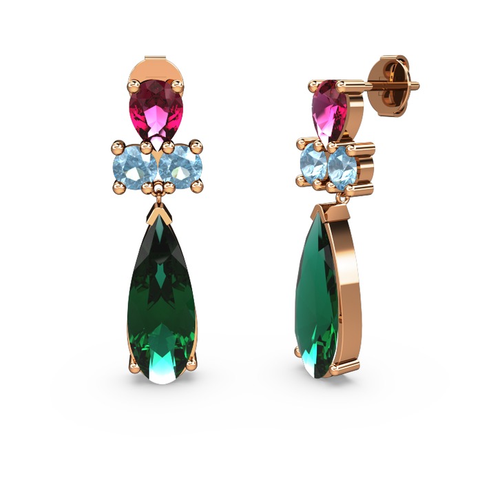 Yeşil kuvars, rodolit garnet ve akuamarin 8 ayar rose altın küpe