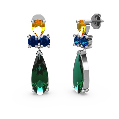 Yeşil kuvars, sitrin ve lab safir 8 ayar beyaz altın küpe