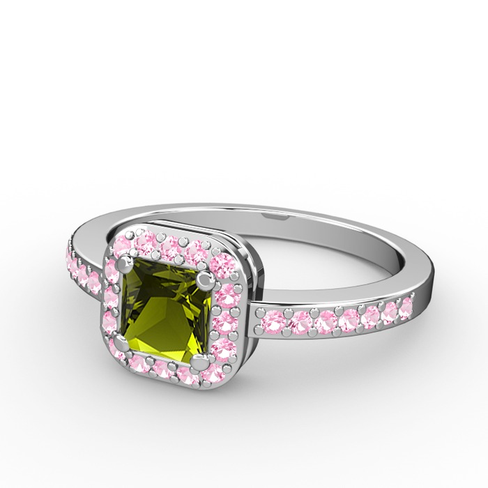 Peridot ve pembe kuvars 14 ayar beyaz altın yüzük