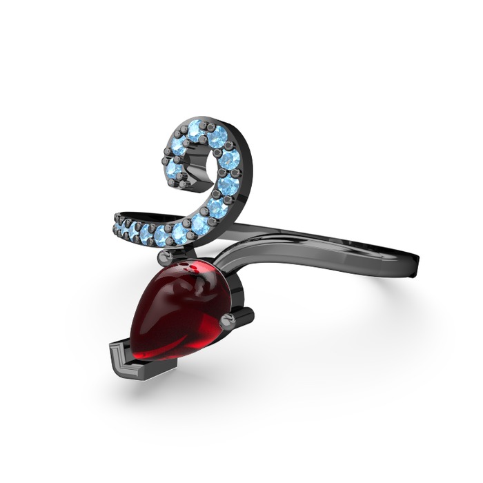 Akuamarin ve garnet 925 ayar siyah rodyum kaplama gümüş yüzük