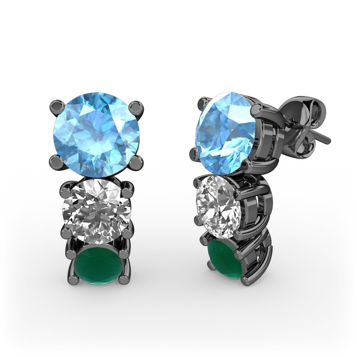 Akuamarin, beyaz zirkon ve kök zümrüt 925 ayar siyah rodyum kaplama gümüş küpe