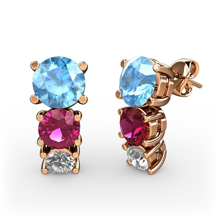 Akuamarin, rodolit garnet ve beyaz zirkon 18 ayar rose altın küpe