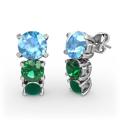 Akuamarin, yeşil kuvars ve kök zümrüt 14 ayar beyaz altın küpe