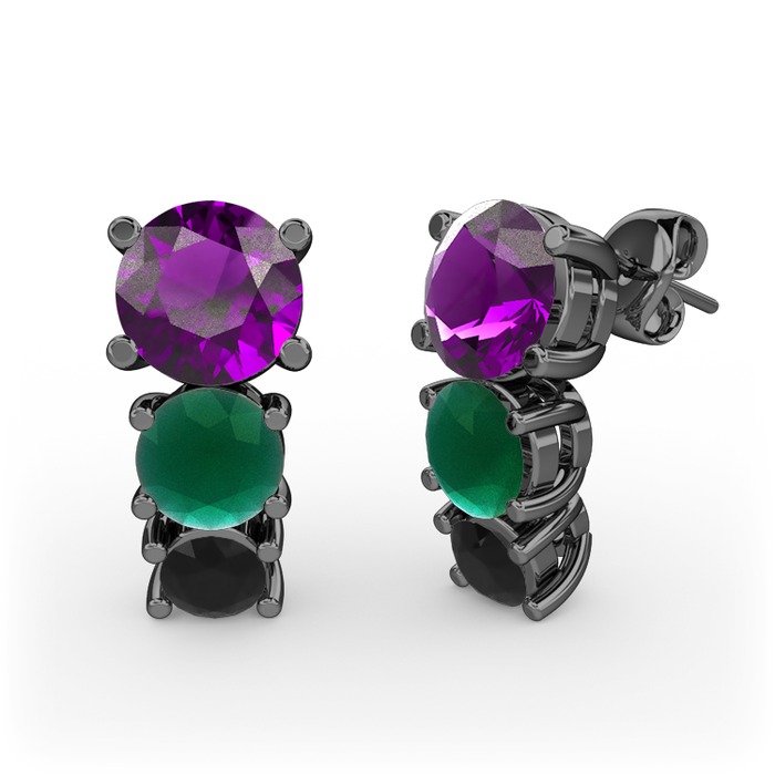 Ametist, kök zümrüt ve siyah zirkon 925 ayar siyah rodyum kaplama gümüş küpe