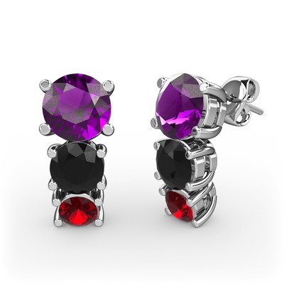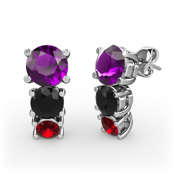 Ametist, siyah zirkon ve garnet 8 ayar beyaz altın küpe