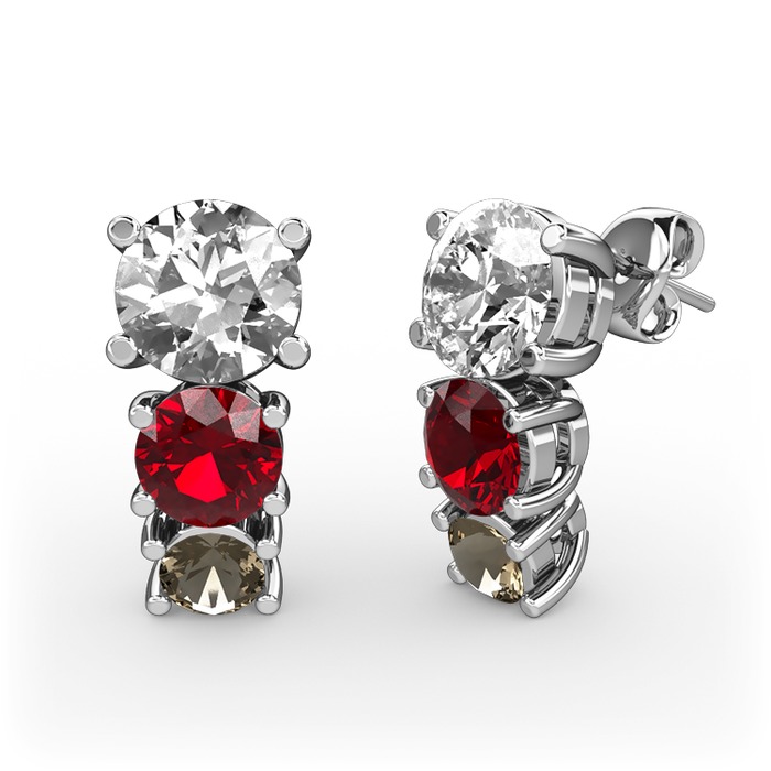 Beyaz zirkon, garnet ve dumanlı kuvars 14 ayar beyaz altın küpe