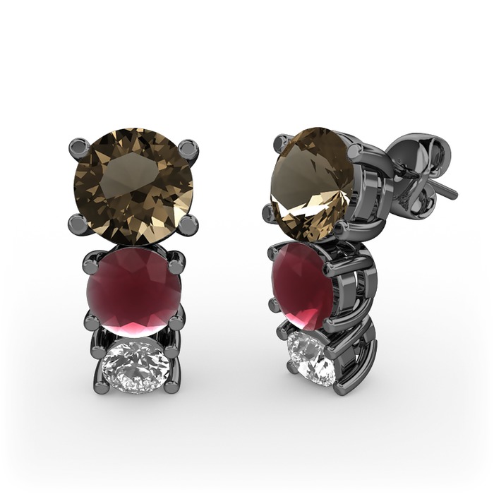 Dumanlı kuvars, kök yakut ve swarovski 925 ayar siyah rodyum kaplama gümüş küpe