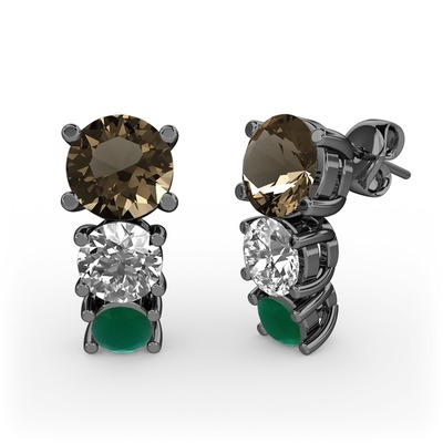 Dumanlı kuvars, pırlanta ve kök zümrüt 925 ayar siyah rodyum kaplama gümüş küpe (0.48 karat)