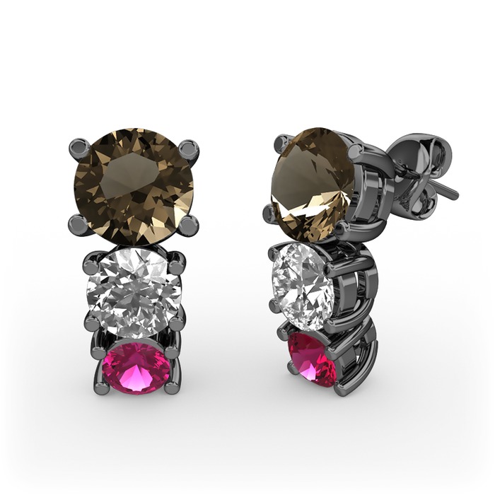Dumanlı kuvars, pırlanta ve rodolit garnet 925 ayar siyah rodyum kaplama gümüş küpe (0.48 karat)