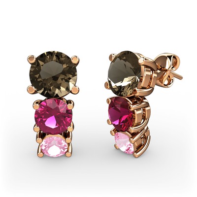 Dumanlı kuvars, rodolit garnet ve pembe kuvars 18 ayar rose altın küpe