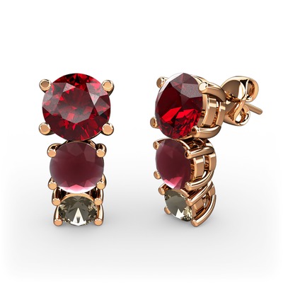Garnet, kök yakut ve dumanlı kuvars 14 ayar rose altın küpe