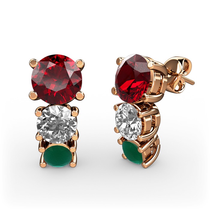 Garnet, swarovski ve kök zümrüt 18 ayar rose altın küpe