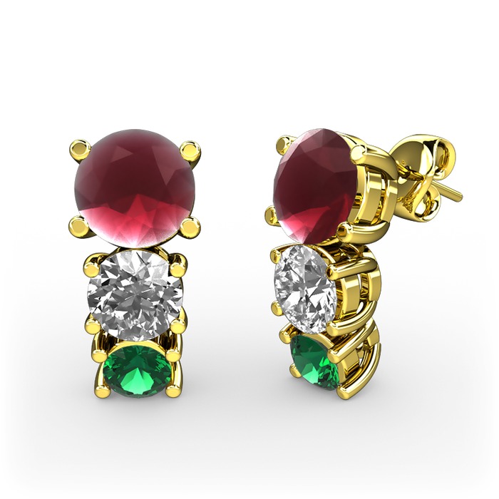 Kök yakut, beyaz zirkon ve yeşil kuvars 14 ayar altın küpe
