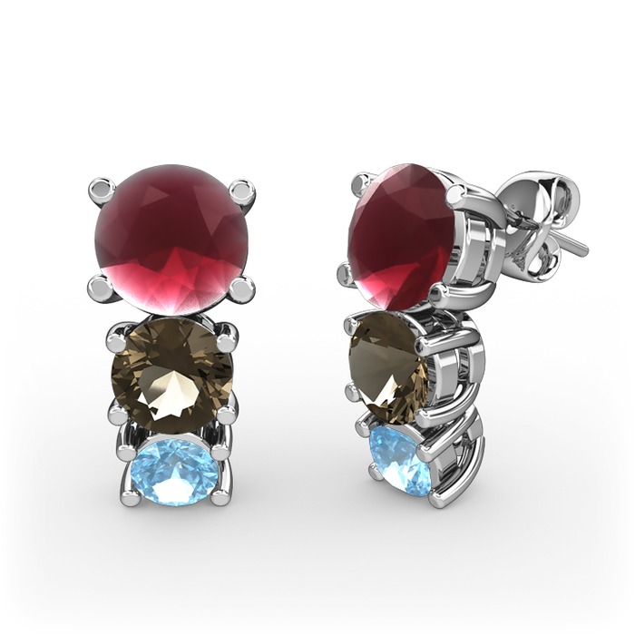 Kök yakut, dumanlı kuvars ve akuamarin 18 ayar beyaz altın küpe