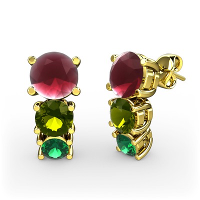 Kök yakut, peridot ve yeşil kuvars 14 ayar altın küpe