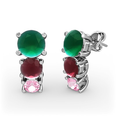 Kök zümrüt, kök yakut ve pembe kuvars 18 ayar beyaz altın küpe