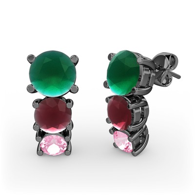 Kök zümrüt, kök yakut ve pembe kuvars 925 ayar siyah rodyum kaplama gümüş küpe
