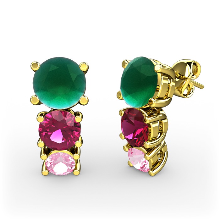 Kök zümrüt, rodolit garnet ve pembe kuvars 8 ayar altın küpe