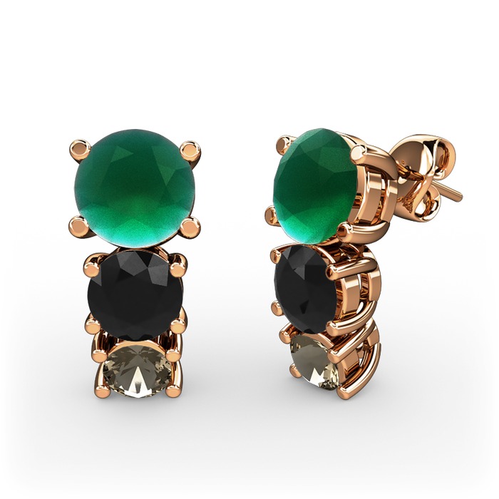 Kök zümrüt, siyah zirkon ve dumanlı kuvars 18 ayar rose altın küpe