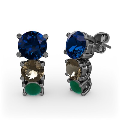 Lab safir, dumanlı kuvars ve kök zümrüt 925 ayar siyah rodyum kaplama gümüş küpe