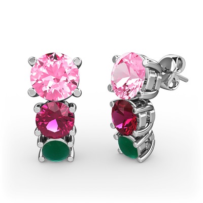 Pembe kuvars, rodolit garnet ve kök zümrüt 8 ayar beyaz altın küpe