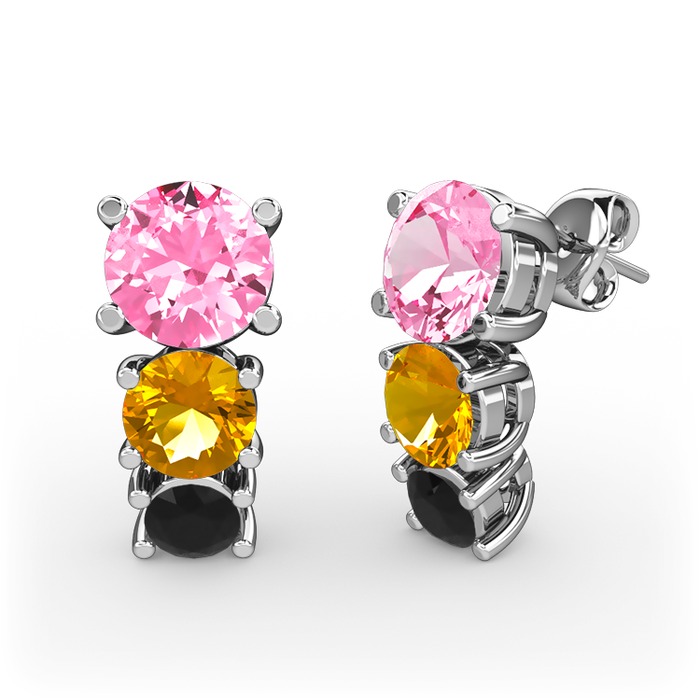 Pembe kuvars, sitrin ve siyah zirkon 14 ayar beyaz altın küpe