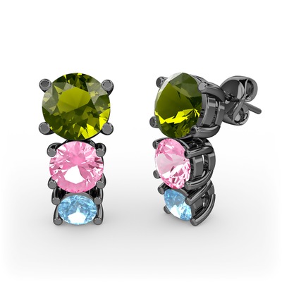 Peridot, pembe kuvars ve akuamarin 925 ayar siyah rodyum kaplama gümüş küpe