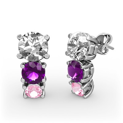 Pırlanta, ametist ve pembe kuvars 8 ayar beyaz altın küpe (1 karat)
