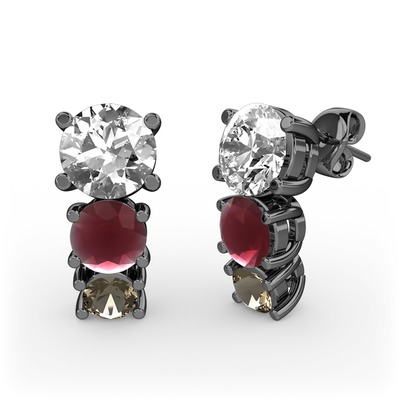 Pırlanta, kök yakut ve dumanlı kuvars 925 ayar siyah rodyum kaplama gümüş küpe (1 karat)