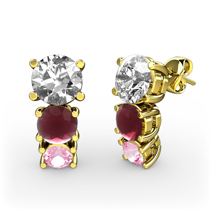 Pırlanta, kök yakut ve pembe kuvars 14 ayar altın küpe (1 karat)
