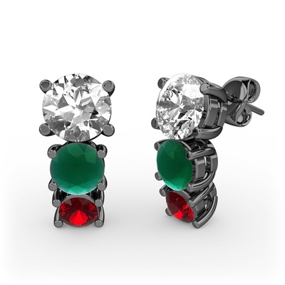 Pırlanta, kök zümrüt ve garnet 925 ayar siyah rodyum kaplama gümüş küpe (1 karat)